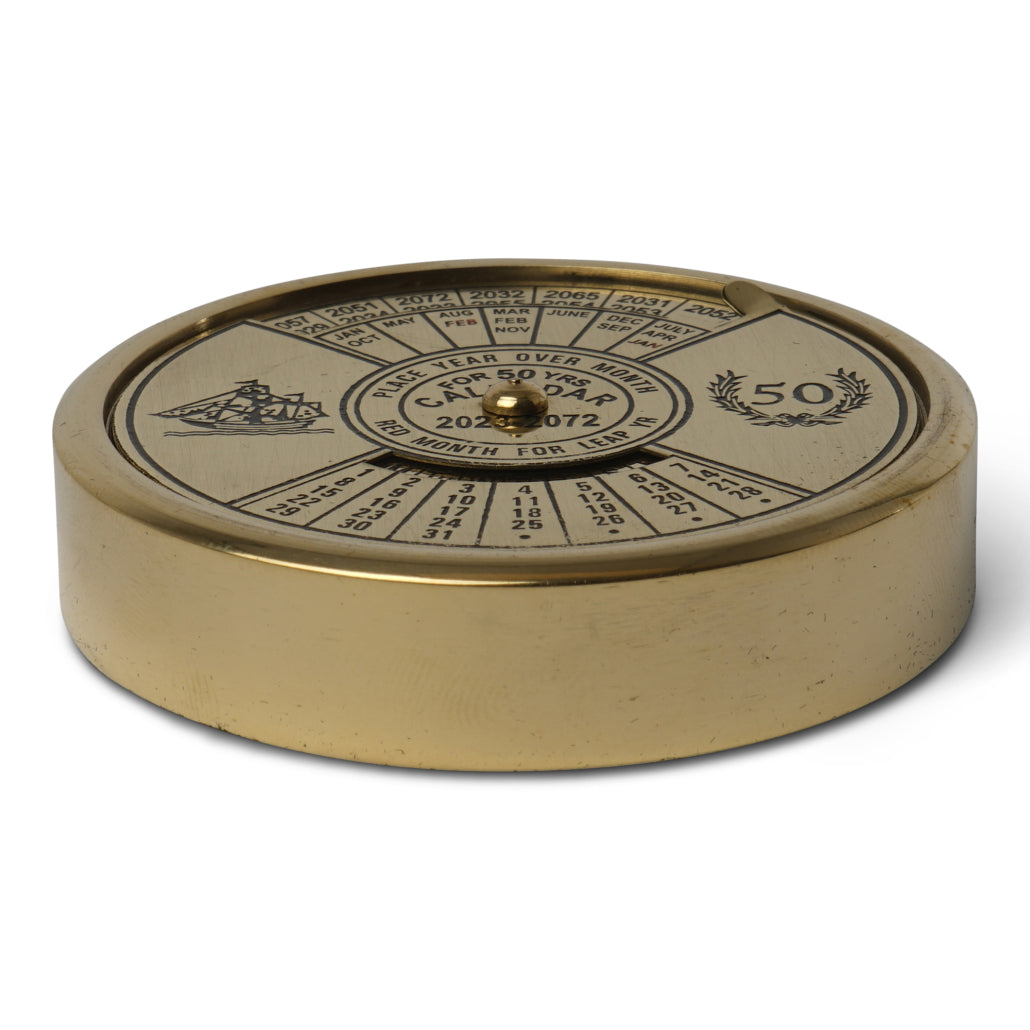 An early, simple pocket calculator from an era when 50 years were akin to perpetual. Its origin goes back some 500 years. Calculate the day of the week for any given future date, within a 50-year span. To use, simply rotate dial until the selected year lines up with the selected month. Locate the particular date and find the day of the week above it.